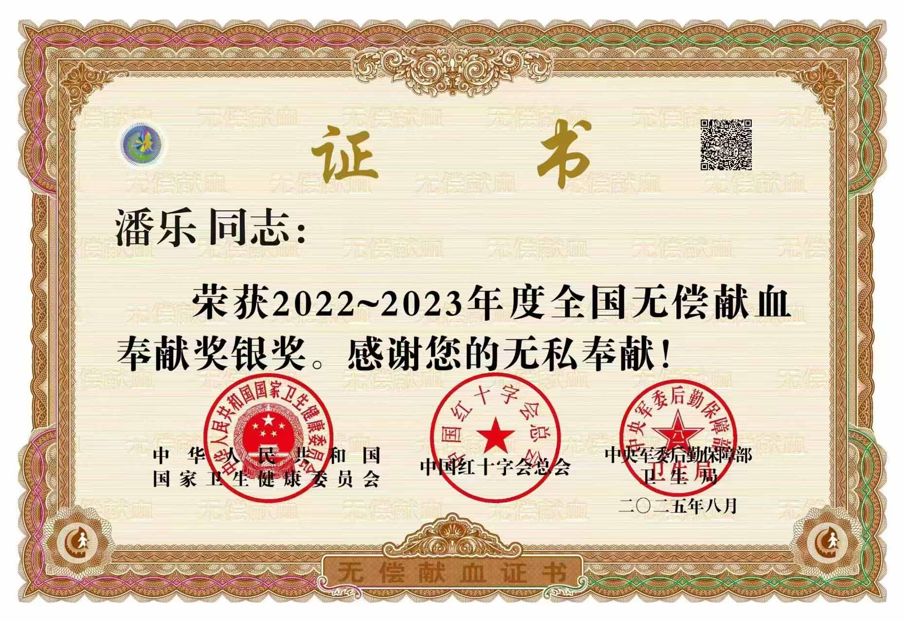 据了解,全国无偿献血奉献奖是依据《中华人民共和国献血法》等设立的国家级奖项,每两年表彰一次,其中银奖授予标准为累计献血量6000毫升以上,而潘乐的献血量,早已远超这一标准。但在他看来,荣誉只是对过去的肯定,更重要的是未来的坚持。