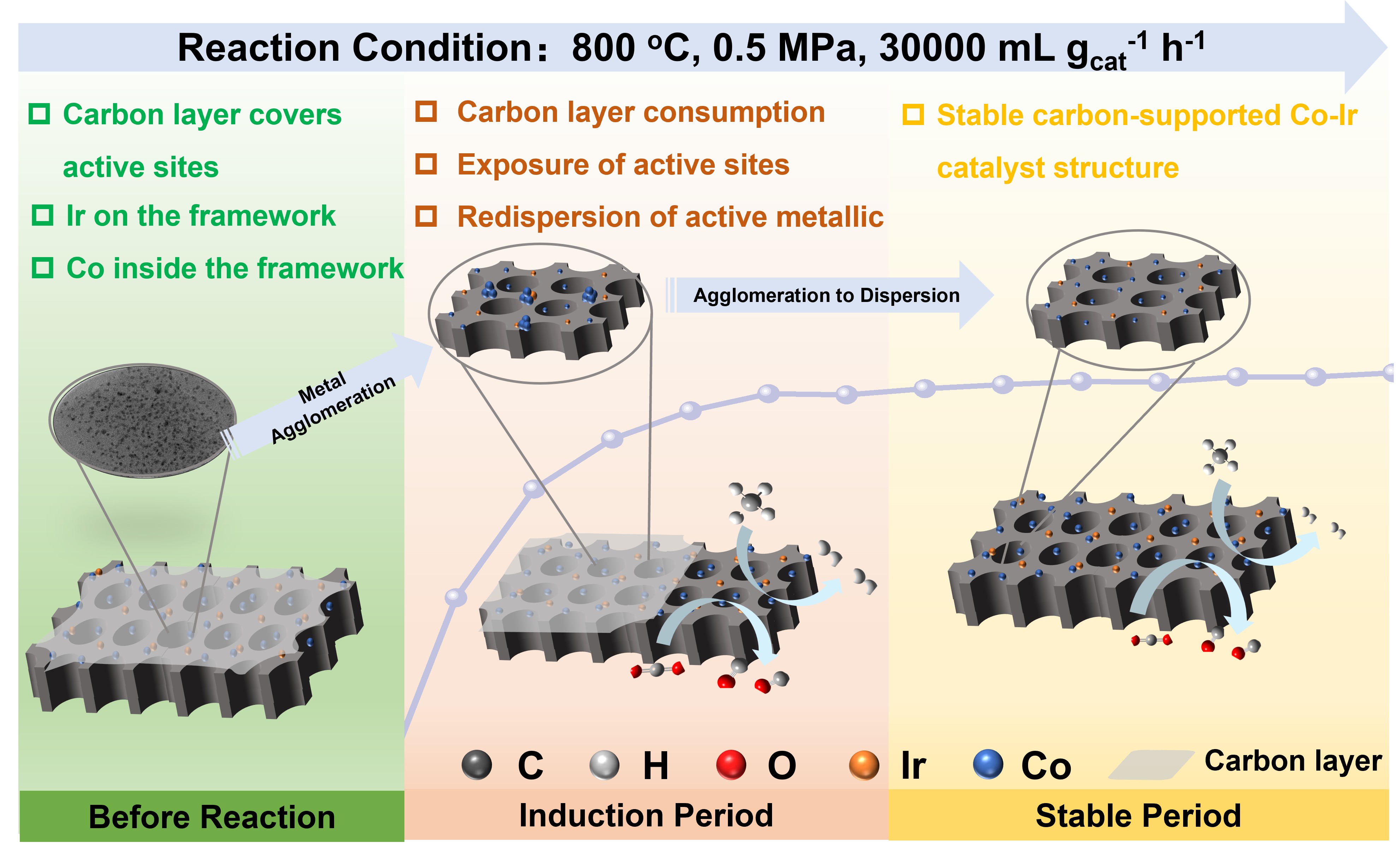 CH4-CO2重整技术(DRM)能同时将两种温室气体转化为高价值的合成气(H2/CO)。在工业应用中,为了降低后续费托合成的压缩成本,加压DRM更具吸引力。然而,压力增加往往会导致严重的催化剂积碳和失活,这是制约该技术工业化的主要瓶颈。为了解决这一难题,研究团队开发了一种碳负载的Co-Ir双金属合金催化剂,巧妙利用褐煤富含含氧官能团的天然结构特点,并引入极低含量的贵金属构筑了高度分散的合金结构。该催化剂在800 oC和0.5 MPa的高温高压环境下连续稳定运行100 h以上,展现出优异的稳定性和抗积碳性能。此外,研究详细阐明了诱导期内金属颗粒的再分散与无定形碳石墨化的动态变化规律,并建立了高温高压环境下催化剂结构演化与催化性能的构效关系。该研究不仅开发出一种低成本、高效率的碳基催化剂,更为加压DRM在工业规模下的稳定运行提供了理论指导。这对于整合下游费托合成工艺、降低天然气转化成本以及实现我国“双碳”目标具有重要的实践意义。